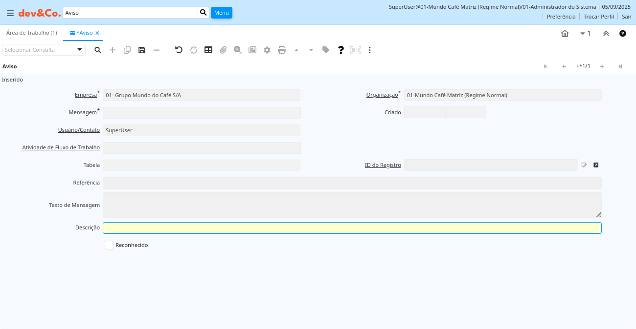| Criado | Data de criação deste registro | O Campo "Criado" indica a data em que este registro foi criado. | ad_note.Created timestamp without time zone Date+Time |