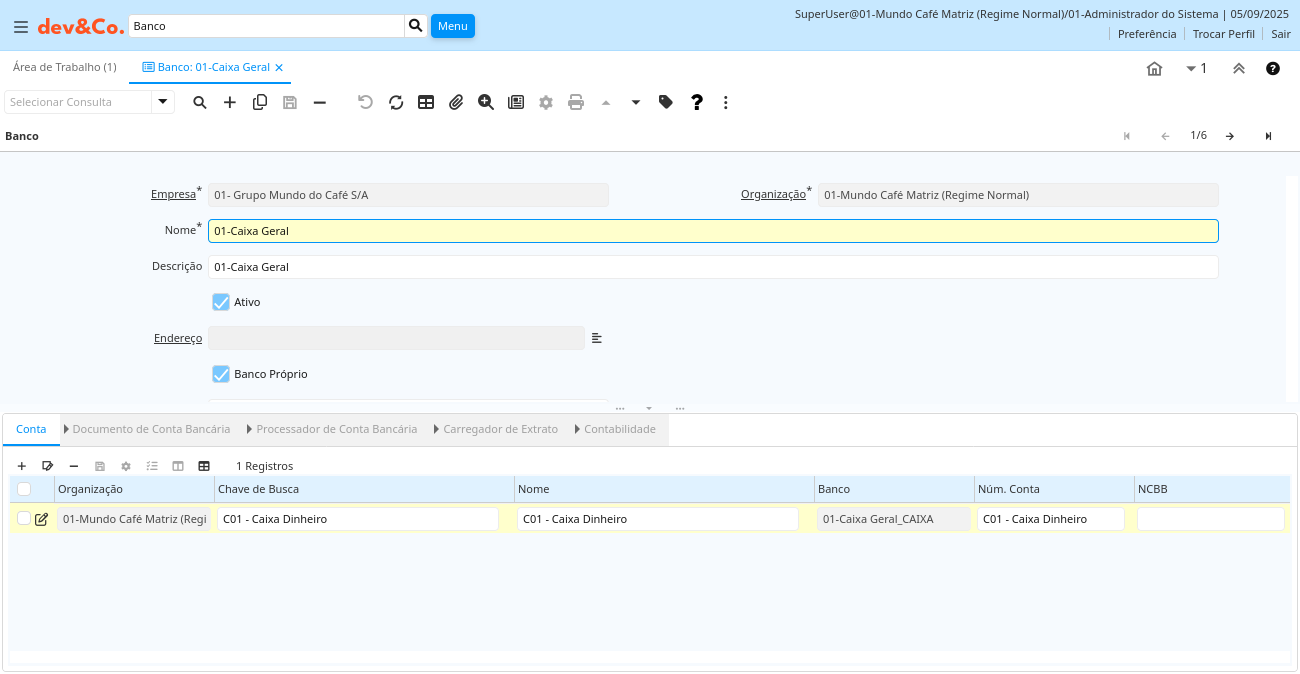 Ajuda: A Aba "Conta" é usada para definir uma ou mais contas em um Banco. Cada conta tem uma Moeda e um Número de Conta exclusivo. A conta bancária da organização é utilizada para a contabilidade.