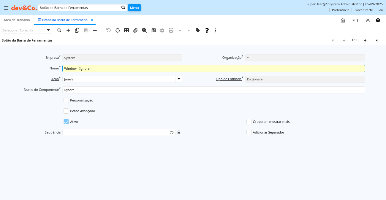 | Seqüência | Método de ordenação de registros; o menor número vem primeiro | A "Seqüência" indica a ordem dos registros | ad_toolbarbutton.SeqNo numeric(10) Integer |