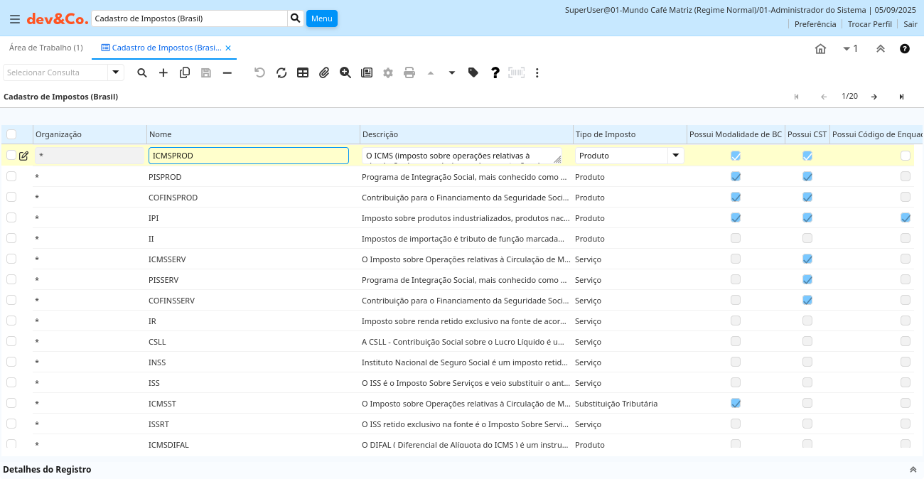 Aba: Cadastro de Impostos (Brasil)