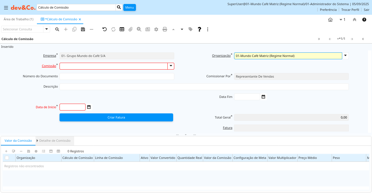 | Data de Início | Primeira data efetiva (inclusive) | A "Data de Início" indica o primeiro dia ou data inicial | c_commissionrun.StartDate timestamp without time zone Date |