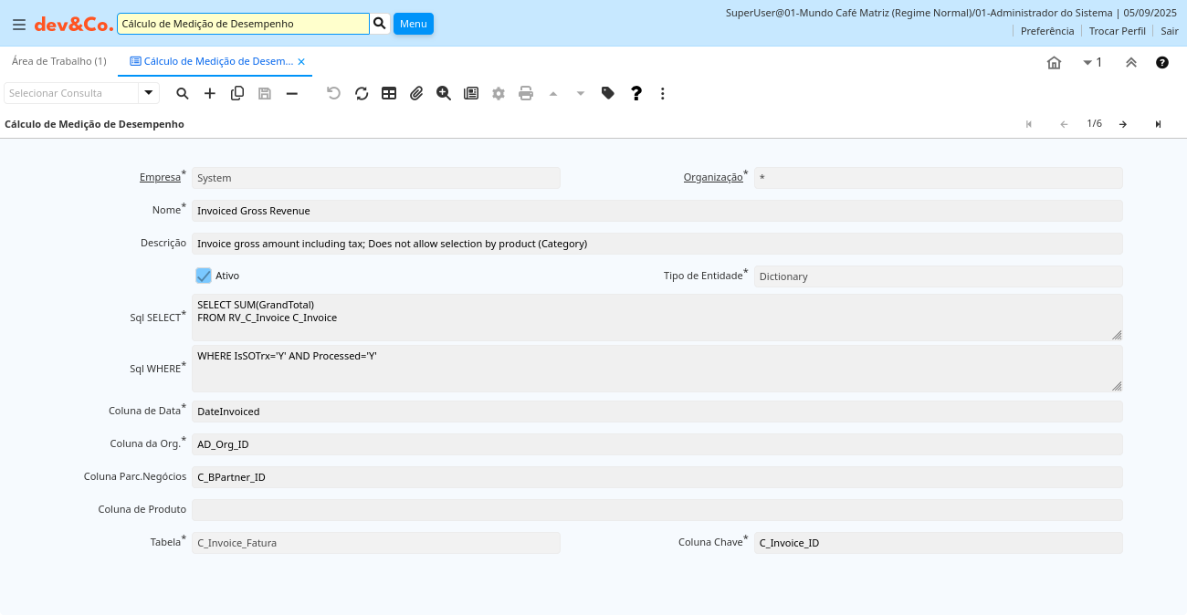 Ajuda: A Aba "Cálculos de Medidas de Desempenho" define como as medidas de desempenho serão calculadas. The sql needs to return a single value. Please check examples. The date trestriction is defined in the Goal. Any restrictions for Organizations, Business Partners, Products, etc. are as Performance Goal Restrictions.