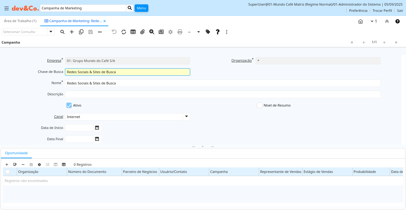 | Ativo | O registro está ativo no sistema | Existem dois métodos de tornar um registro indisponível no sistema: O primeiro é excluir o registro, o outro é desativar o registro. Um registro desativado não está disponível para seleção, mas está disponível para relatórios. Existem duas razões para desativar um registro ao invés de excluí-lo: (1) O sistema exige o registro para fins de auditoria. (2) O registro é referenciado por outros registros. Ex. você não pode excluir um Parceiro de Negócios, se existirem faturas para este parceiro de negócios. Você desativa o Parceiro de Negócios e previne que este registro seja usado para entradas futuras. | c_campaign.IsActive character(1) Yes-No |