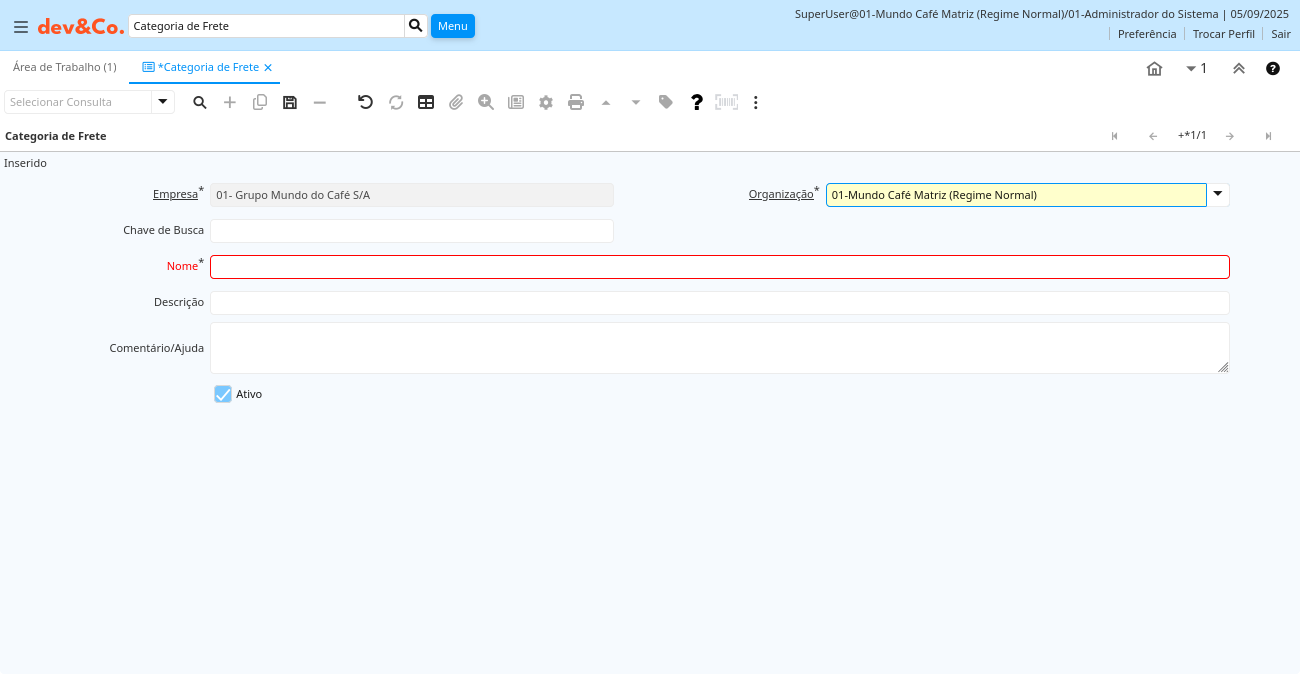 | Ativo | O registro está ativo no sistema | Existem dois métodos de tornar um registro indisponível no sistema: O primeiro é excluir o registro, o outro é desativar o registro. Um registro desativado não está disponível para seleção, mas está disponível para relatórios. Existem duas razões para desativar um registro ao invés de excluí-lo: (1) O sistema exige o registro para fins de auditoria. (2) O registro é referenciado por outros registros. Ex. você não pode excluir um Parceiro de Negócios, se existirem faturas para este parceiro de negócios. Você desativa o Parceiro de Negócios e previne que este registro seja usado para entradas futuras. | m_freightcategory.IsActive character(1) Yes-No |