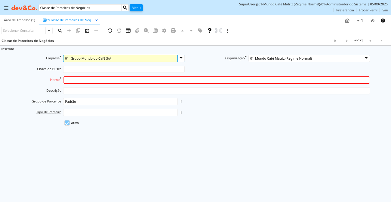 | Chave de Busca | Chave de pesquisa para o registro no formato necessário - tem que ser único e exclusivo | Uma "Chave de Busca" fornece a você um método rápido de encontrar um registro em particular. Se você deixar a chave de busca vazia, o sistema automaticamente cria um valor numérico. A seqüência de documento usada por este número de recuperação é definida na janela "Gerenciamento de Seqüência" com o nome "DocumentNo_", onde TableName é o nome real da tabela (ex: C_Order). | cof_classeparceiro.Value character varying(40) String |