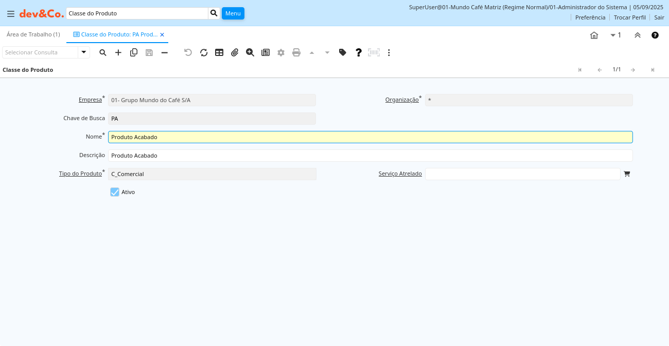 | Ativo | O registro está ativo no sistema | Existem dois métodos de tornar um registro indisponível no sistema: O primeiro é excluir o registro, o outro é desativar o registro. Um registro desativado não está disponível para seleção, mas está disponível para relatórios. Existem duas razões para desativar um registro ao invés de excluí-lo: (1) O sistema exige o registro para fins de auditoria. (2) O registro é referenciado por outros registros. Ex. você não pode excluir um Parceiro de Negócios, se existirem faturas para este parceiro de negócios. Você desativa o Parceiro de Negócios e previne que este registro seja usado para entradas futuras. | cof_productclass.IsActive character(1) Yes-No |
