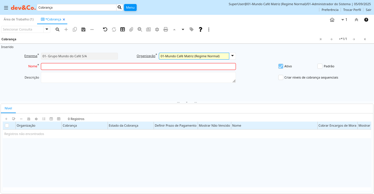 Ajuda: A Aba "Cobrança" define os parâmetros para um nível de cobrança.