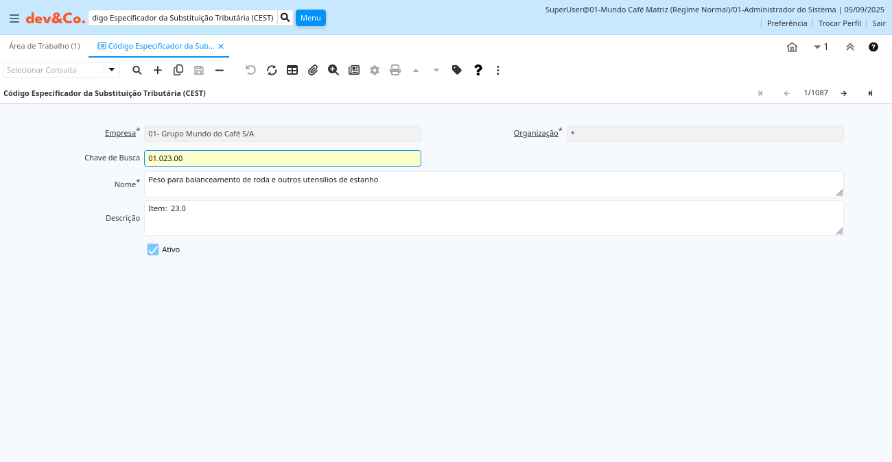 | Chave de Busca | Chave de pesquisa para o registro no formato necessário - tem que ser único e exclusivo | Uma "Chave de Busca" fornece a você um método rápido de encontrar um registro em particular. Se você deixar a chave de busca vazia, o sistema automaticamente cria um valor numérico. A seqüência de documento usada por este número de recuperação é definida na janela "Gerenciamento de Seqüência" com o nome "DocumentNo_", onde TableName é o nome real da tabela (ex: C_Order). | cof_cest.Value character varying(40) String |