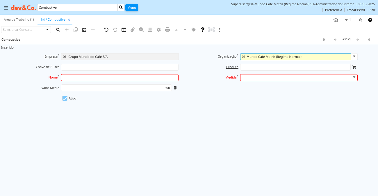 | Chave de Busca | Chave de pesquisa para o registro no formato necessário - tem que ser único e exclusivo | Uma "Chave de Busca" fornece a você um método rápido de encontrar um registro em particular. Se você deixar a chave de busca vazia, o sistema automaticamente cria um valor numérico. A seqüência de documento usada por este número de recuperação é definida na janela "Gerenciamento de Seqüência" com o nome "DocumentNo_", onde TableName é o nome real da tabela (ex: C_Order). | cof_combustivel.Value character varying(40) String |