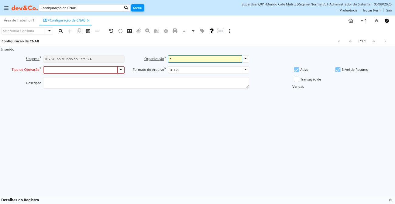 | Tipo de Operação | cof_c_cnabconfig.cof_OperationType character varying(3) List | ||