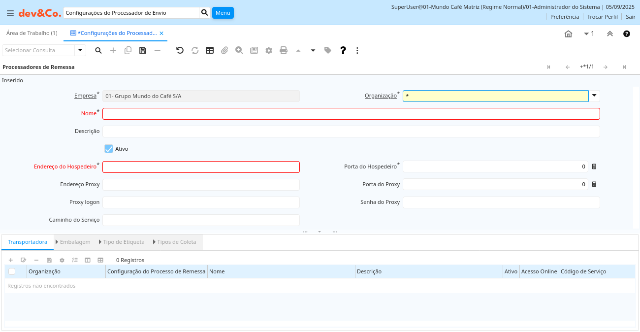 Ajuda: A aba Transportadoras define qualquer entidade que irá realizar o transporte de/para uma Organização