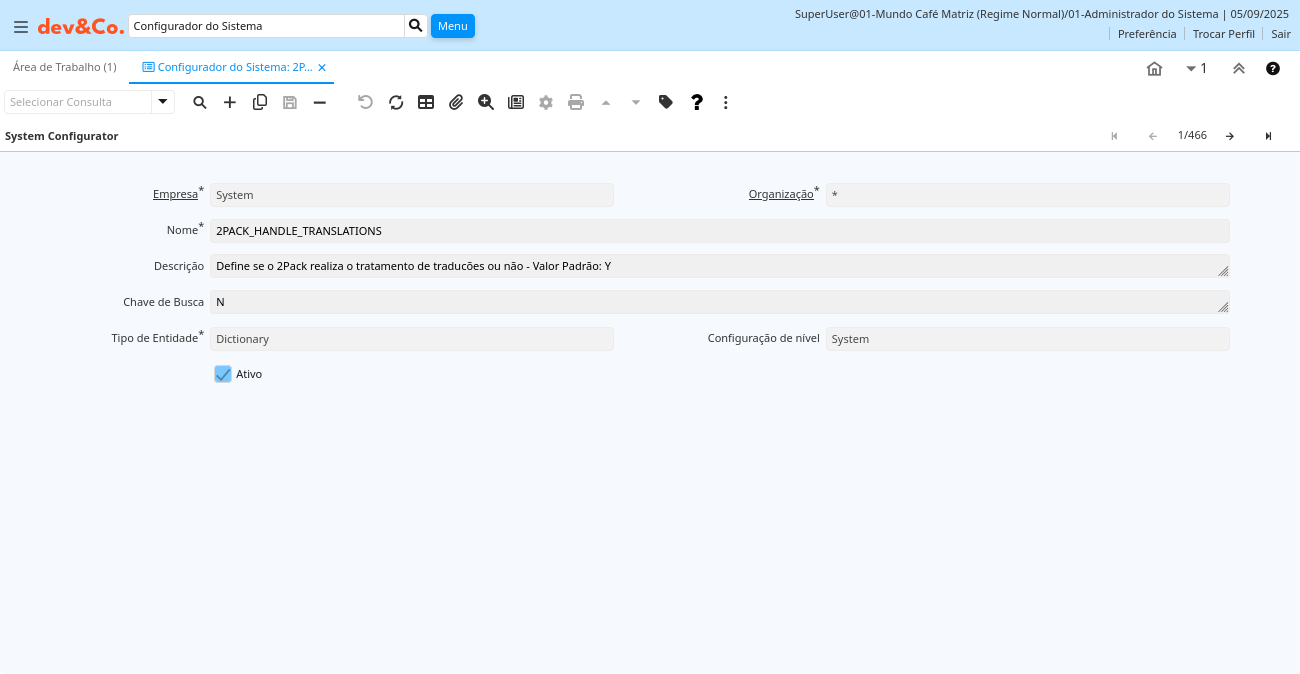 | Ativo | O registro está ativo no sistema | Existem dois métodos de tornar um registro indisponível no sistema: O primeiro é excluir o registro, o outro é desativar o registro. Um registro desativado não está disponível para seleção, mas está disponível para relatórios. Existem duas razões para desativar um registro ao invés de excluí-lo: (1) O sistema exige o registro para fins de auditoria. (2) O registro é referenciado por outros registros. Ex. você não pode excluir um Parceiro de Negócios, se existirem faturas para este parceiro de negócios. Você desativa o Parceiro de Negócios e previne que este registro seja usado para entradas futuras. | ad_sysconfig.IsActive character(1) Yes-No |