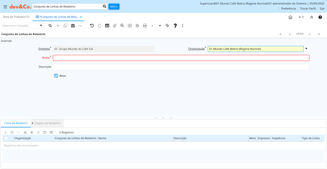 Ajuda: O Conjunto de Linhas determina quais linhas serão impressas em um Relatório Financeiro