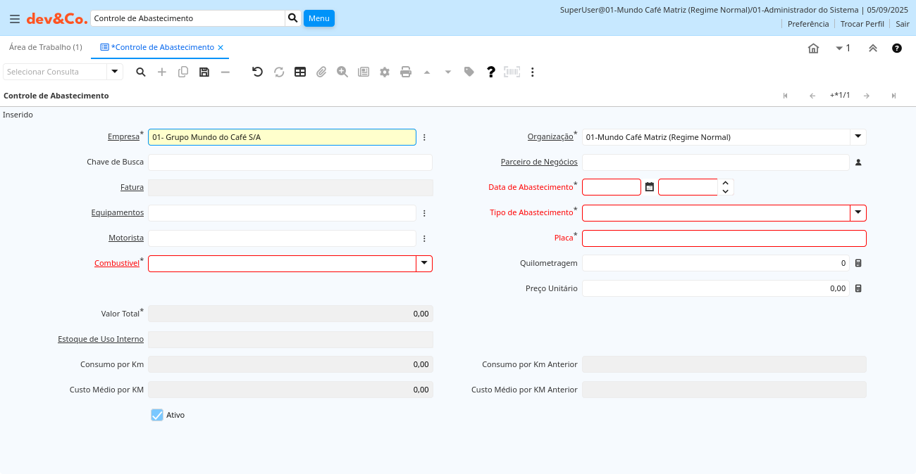 | Chave de Busca | Chave de pesquisa para o registro no formato necessário - tem que ser único e exclusivo | Uma "Chave de Busca" fornece a você um método rápido de encontrar um registro em particular. Se você deixar a chave de busca vazia, o sistema automaticamente cria um valor numérico. A seqüência de documento usada por este número de recuperação é definida na janela "Gerenciamento de Seqüência" com o nome "DocumentNo_", onde TableName é o nome real da tabela (ex: C_Order). | cof_controleabastecimento.Value character varying(40) String |