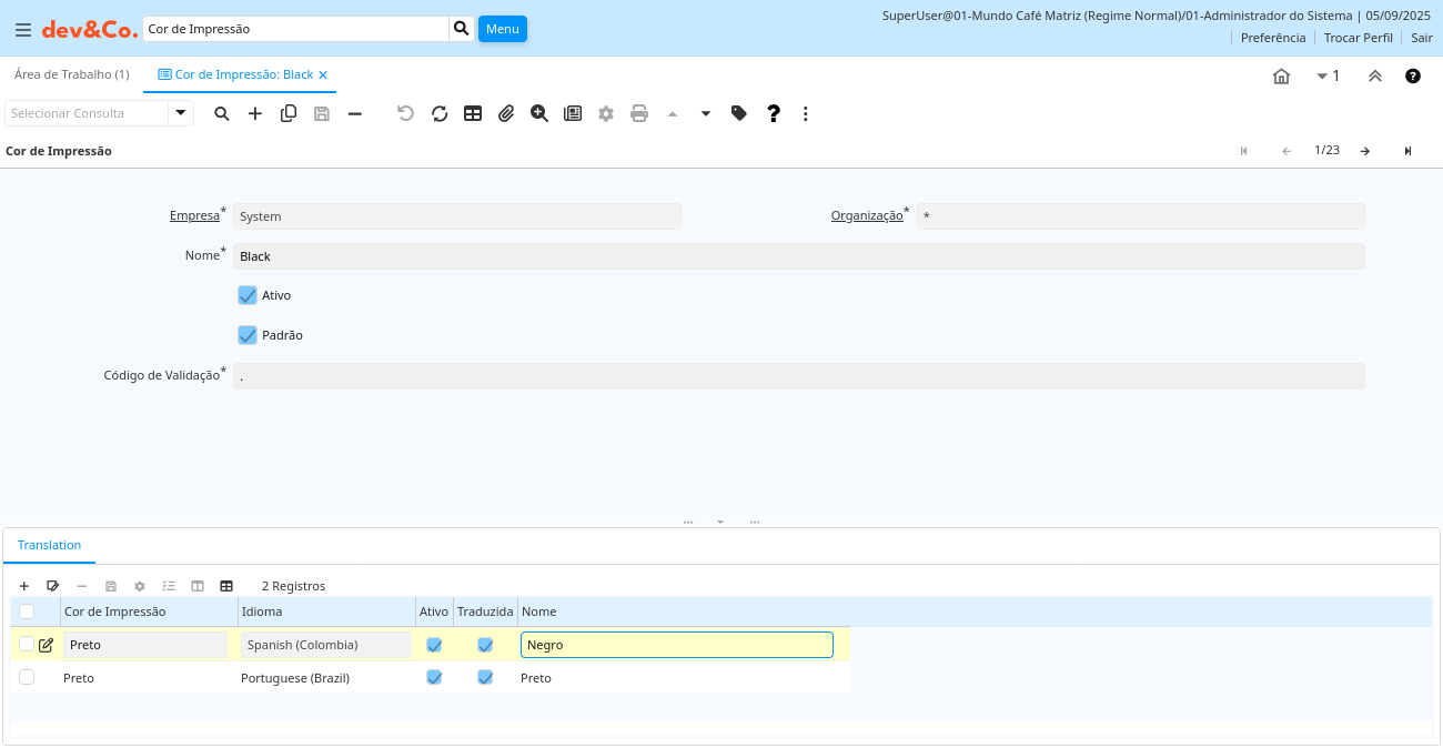 | Ativo | O registro está ativo no sistema | Existem dois métodos de tornar um registro indisponível no sistema: O primeiro é excluir o registro, o outro é desativar o registro. Um registro desativado não está disponível para seleção, mas está disponível para relatórios. Existem duas razões para desativar um registro ao invés de excluí-lo: (1) O sistema exige o registro para fins de auditoria. (2) O registro é referenciado por outros registros. Ex. você não pode excluir um Parceiro de Negócios, se existirem faturas para este parceiro de negócios. Você desativa o Parceiro de Negócios e previne que este registro seja usado para entradas futuras. | ad_printcolor_trl.IsActive character(1) Yes-No |