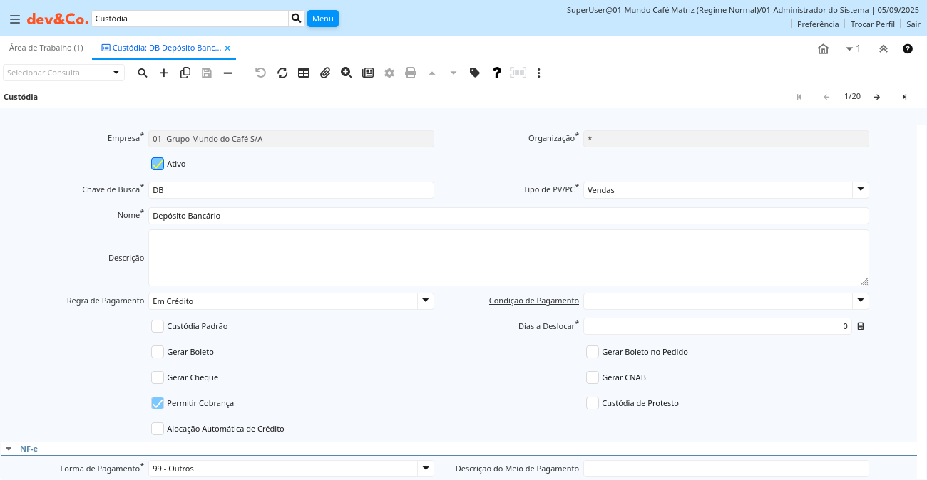| Ativo | O registro está ativo no sistema | Existem dois métodos de tornar um registro indisponível no sistema: O primeiro é excluir o registro, o outro é desativar o registro. Um registro desativado não está disponível para seleção, mas está disponível para relatórios. Existem duas razões para desativar um registro ao invés de excluí-lo: (1) O sistema exige o registro para fins de auditoria. (2) O registro é referenciado por outros registros. Ex. você não pode excluir um Parceiro de Negócios, se existirem faturas para este parceiro de negócios. Você desativa o Parceiro de Negócios e previne que este registro seja usado para entradas futuras. | cof_c_custody.IsActive character(1) Yes-No |
