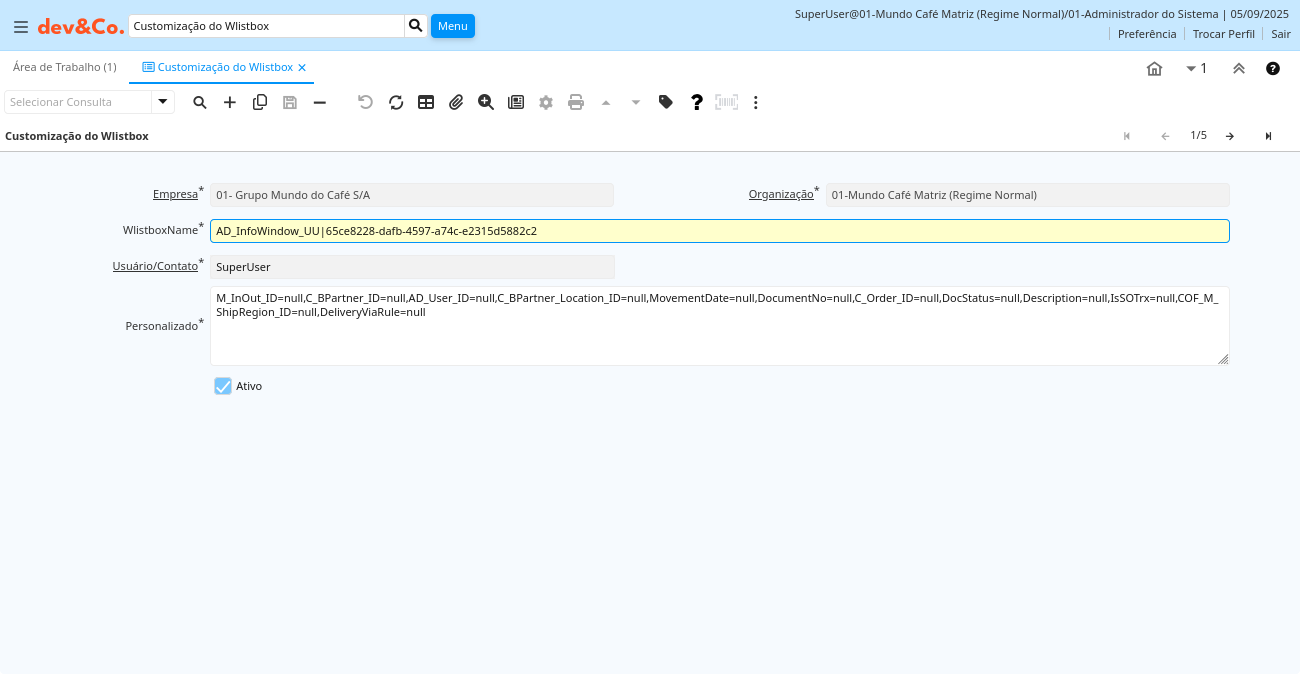 | Ativo | O registro está ativo no sistema | Existem dois métodos de tornar um registro indisponível no sistema: O primeiro é excluir o registro, o outro é desativar o registro. Um registro desativado não está disponível para seleção, mas está disponível para relatórios. Existem duas razões para desativar um registro ao invés de excluí-lo: (1) O sistema exige o registro para fins de auditoria. (2) O registro é referenciado por outros registros. Ex. você não pode excluir um Parceiro de Negócios, se existirem faturas para este parceiro de negócios. Você desativa o Parceiro de Negócios e previne que este registro seja usado para entradas futuras. | ad_wlistbox_customization.IsActive character(1) Yes-No |
