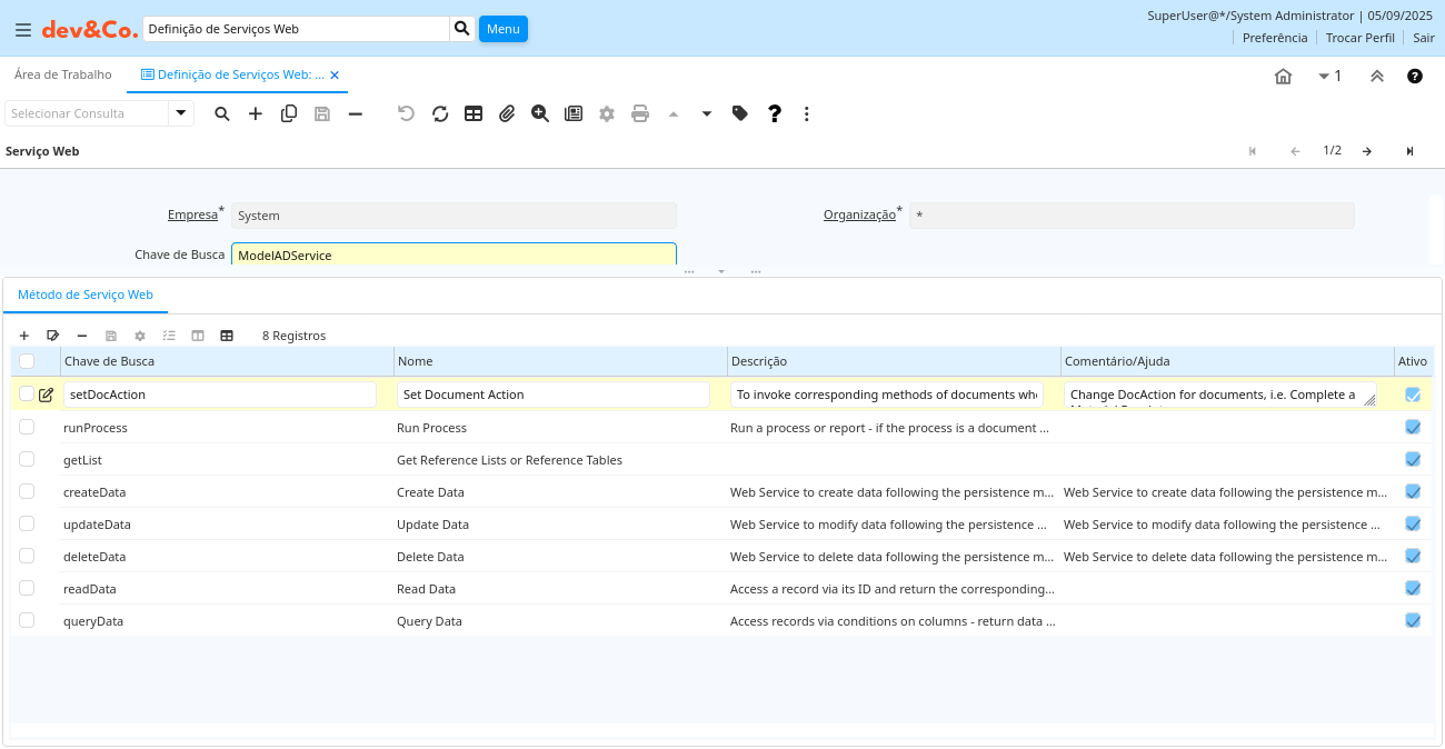 | Organização | Entidade organizacional dentro da Empresa | Uma "Organização" é uma unidade de sua "Empresa" ou "Entidade Legal" - os exemplos são loja, departamento. Você pode compartilhar dados entre organizações. | ws_webservicemethod.AD_Org_ID numeric(10) Table Direct |