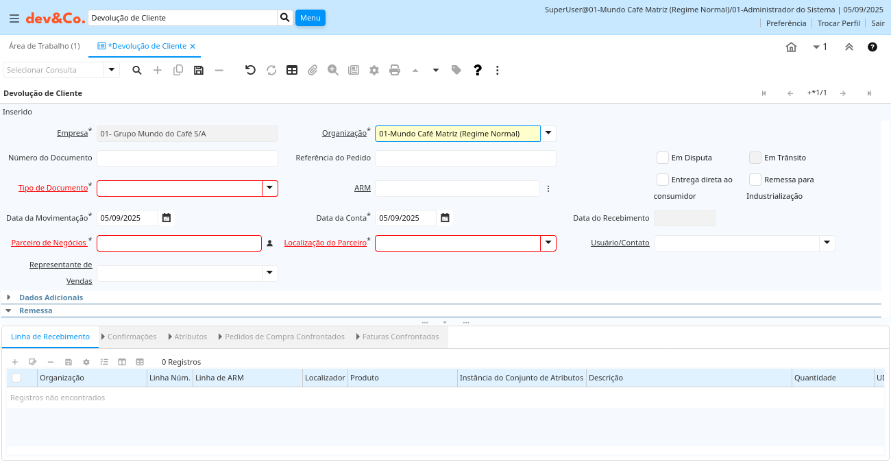 Ajuda: A janela de Devolução de Cliente define o recebimento do produto ou material de uma Devolução de Cliente.