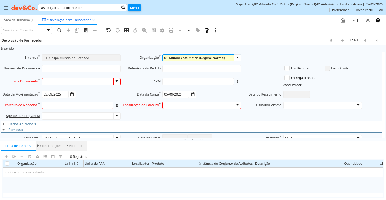 | ARM | Autorização de Retorno de Material | Uma Autorização de Retorno de Material pode ser exigida para aceitar devoluções e para criar Avisos de Crédito | m_inout.M_RMA_ID numeric(10) Search |