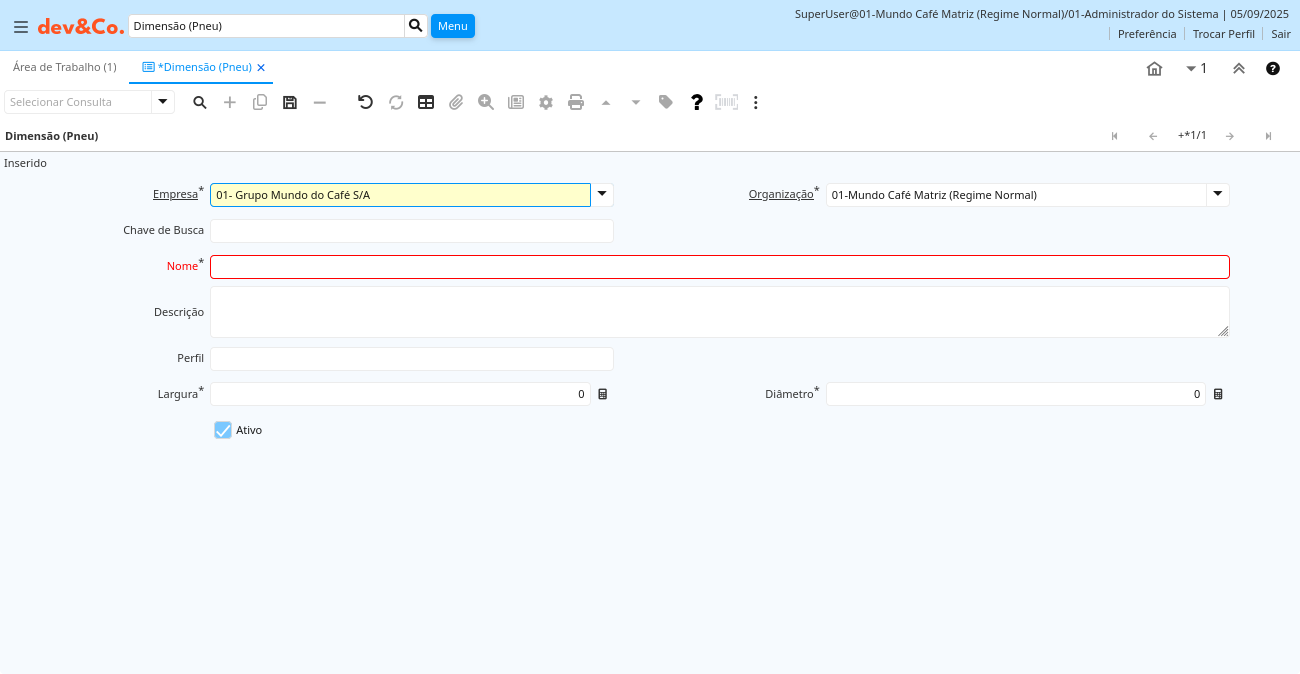 | Chave de Busca | Chave de pesquisa para o registro no formato necessário - tem que ser único e exclusivo | Uma "Chave de Busca" fornece a você um método rápido de encontrar um registro em particular. Se você deixar a chave de busca vazia, o sistema automaticamente cria um valor numérico. A seqüência de documento usada por este número de recuperação é definida na janela "Gerenciamento de Seqüência" com o nome "DocumentNo_", onde TableName é o nome real da tabela (ex: C_Order). | cof_pneu_dimensao.Value character varying(40) String |