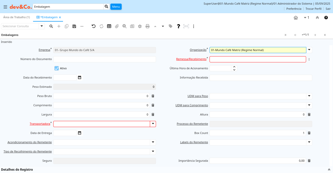 | Remessa/Recebimento | Documento de Remessa de Material | Remessa/Recebimento de Material | m_package.M_InOut_ID numeric(10) Search |
