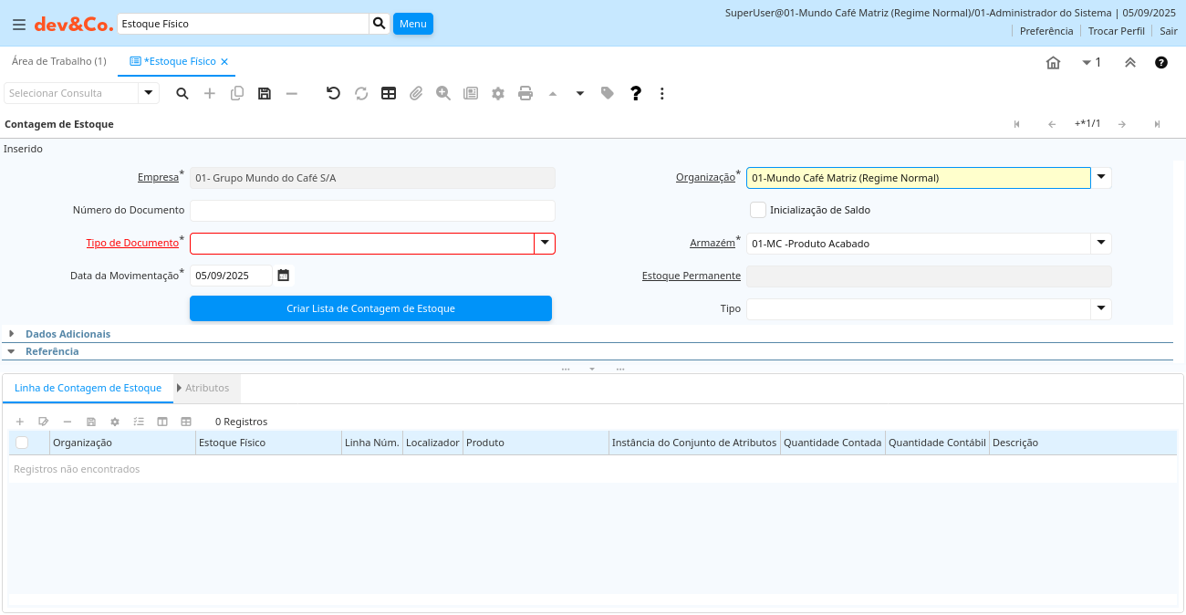 Ajuda: A Janela "Estoque Físico" permite a você gerar listas de contagem de estoque. Estas contagens podem então ser processadas o que irá atualizar o estoque real com as novas contagens. Normalmente, você iria criar "Linhas de Contagem de Estoque" automaticamente. Se você as criar manualmente, certifique-se que o "Valor Contábil" esteja correto.