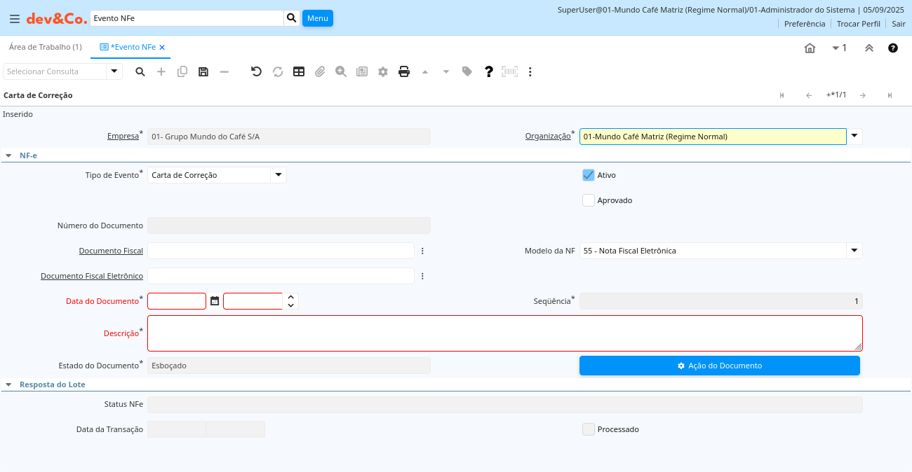 | Estado do Documento | O estado atual do documento | O "Estado do Documento" indica o estado de um documento neste momento. Se você deseja alterar o Estado do Documento, use o campo "Ação do Documento" | lbr_eventonfe.DocStatus character varying(2) List |