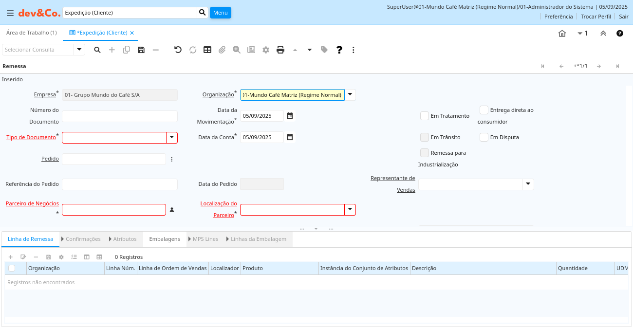 Ajuda: A Janela "Expedição" define remessas feitas ou a serem feitas para um cliente. Elas são geradas a partir de um Pedido de Cliente. O Documento de Remessa vai gerar a Fatura de Cliente.