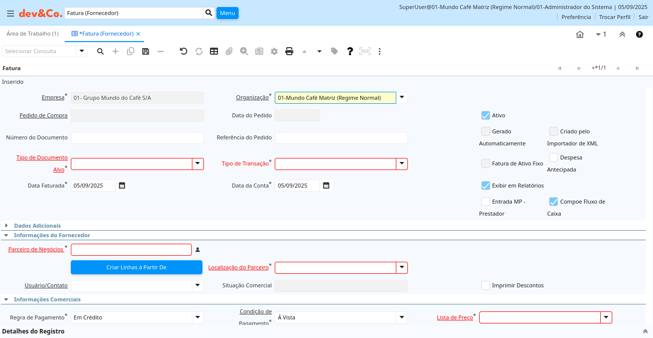 Ajuda: A Aba "Fatura" define os parâmetros de uma Fatura gerada por um Parceiro de Negócios. Ela se constitue em contas a pagar. When generating a Receipt, the receipt document type of the purchase is used - or if not used/defined the default Material Receipt Document type.