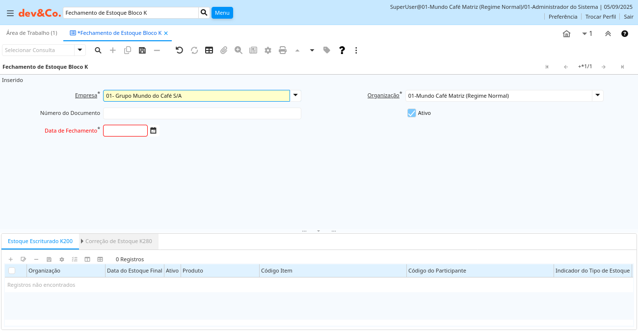Aba: Fechamento de Estoque Bloco K