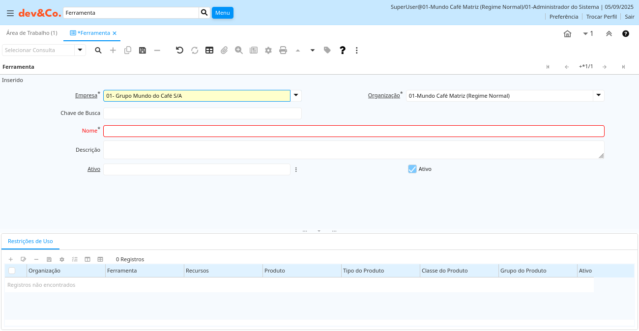 | Chave de Busca | Chave de pesquisa para o registro no formato necessário - tem que ser único e exclusivo | Uma "Chave de Busca" fornece a você um método rápido de encontrar um registro em particular. Se você deixar a chave de busca vazia, o sistema automaticamente cria um valor numérico. A seqüência de documento usada por este número de recuperação é definida na janela "Gerenciamento de Seqüência" com o nome "DocumentNo_", onde TableName é o nome real da tabela (ex: C_Order). | cof_pp_ferramenta.Value character varying(40) String |