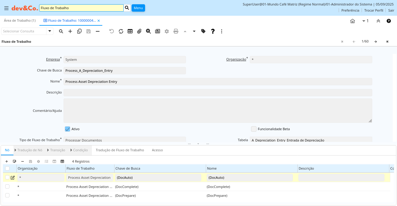 | Ativo | O registro está ativo no sistema | Existem dois métodos de tornar um registro indisponível no sistema: O primeiro é excluir o registro, o outro é desativar o registro. Um registro desativado não está disponível para seleção, mas está disponível para relatórios. Existem duas razões para desativar um registro ao invés de excluí-lo: (1) O sistema exige o registro para fins de auditoria. (2) O registro é referenciado por outros registros. Ex. você não pode excluir um Parceiro de Negócios, se existirem faturas para este parceiro de negócios. Você desativa o Parceiro de Negócios e previne que este registro seja usado para entradas futuras. | ad_workflow.IsActive character(1) Yes-No |