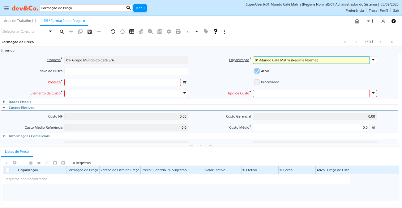 | Custo Médio | Valor preenchido com o preço de custo atual do produto em questão, levando em consideração o tipo de custo e o elemento de custo preenchidos na janela | cof_formacaopreco.cof_customedio numeric Number | |