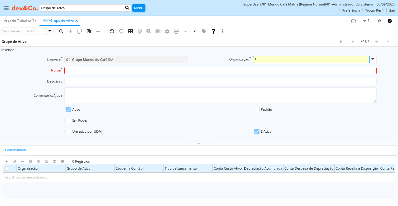 | Em Poder | O ativo é de propriedade da organização | O ativo pode não estar em posse, mas é legalmente de propriedade da organização | a_asset_group.IsOwned character(1) Yes-No |