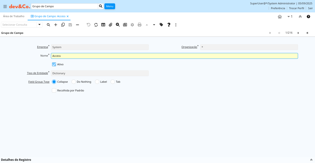 Descrição: Somente para uso do Administrador do Sistema. Grupos de Campo permitem o agrupamento de campos em uma janela