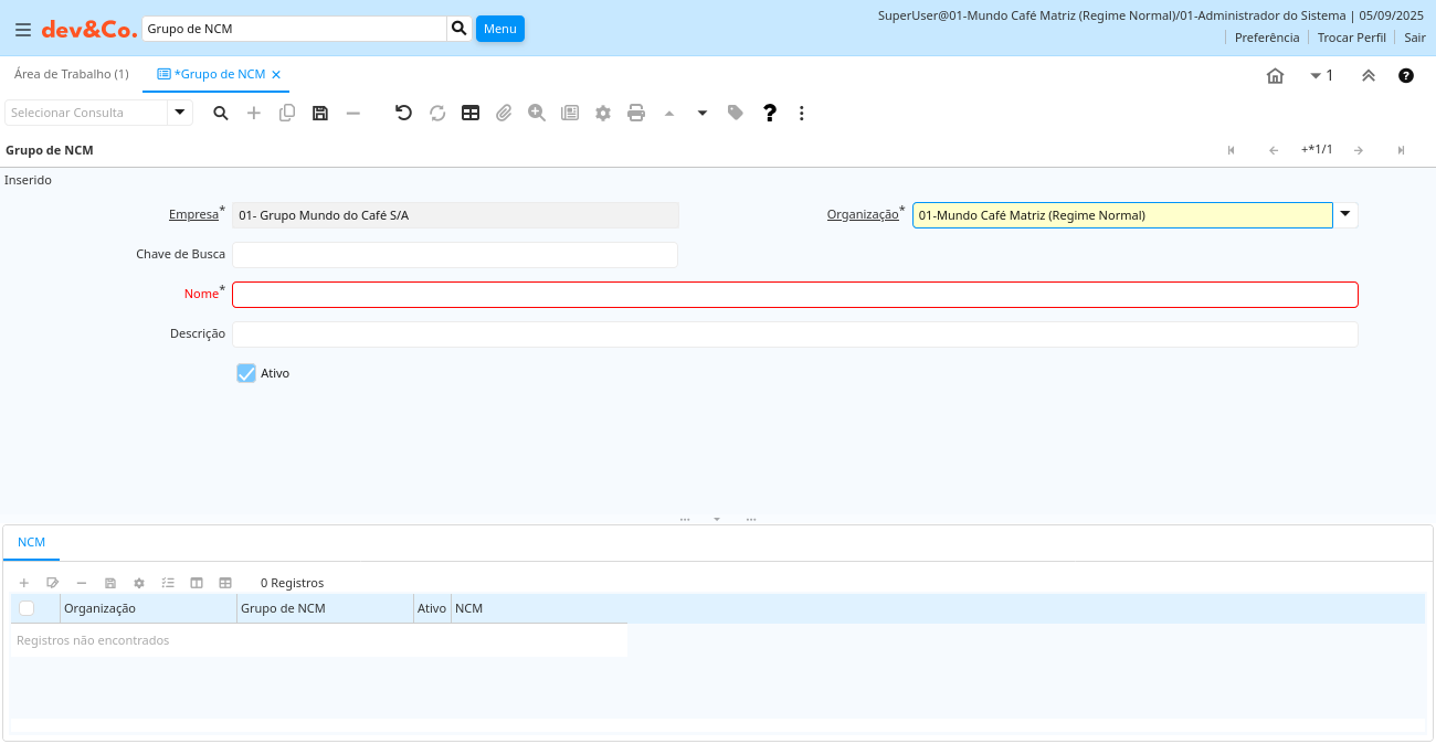 | Chave de Busca | Chave de pesquisa para o registro no formato necessário - tem que ser único e exclusivo | Uma "Chave de Busca" fornece a você um método rápido de encontrar um registro em particular. Se você deixar a chave de busca vazia, o sistema automaticamente cria um valor numérico. A seqüência de documento usada por este número de recuperação é definida na janela "Gerenciamento de Seqüência" com o nome "DocumentNo_", onde TableName é o nome real da tabela (ex: C_Order). | cof_gruponcm.Value character varying(40) String |