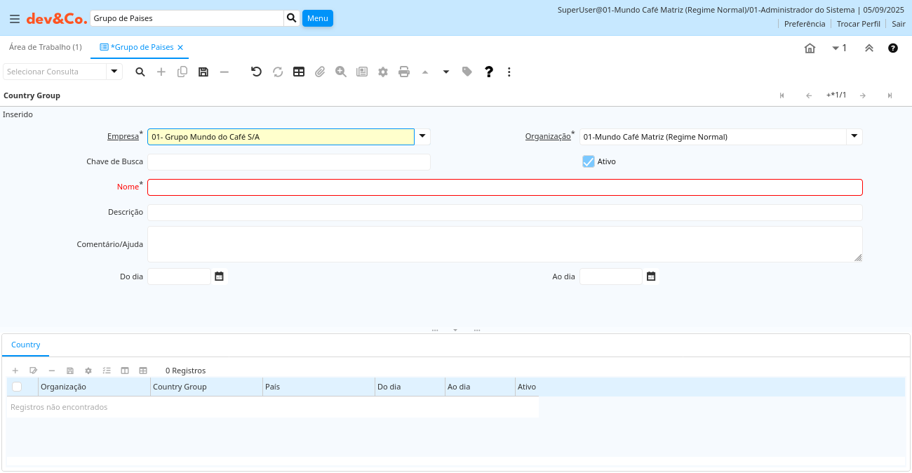 | Ativo | O registro está ativo no sistema | Existem dois métodos de tornar um registro indisponível no sistema: O primeiro é excluir o registro, o outro é desativar o registro. Um registro desativado não está disponível para seleção, mas está disponível para relatórios. Existem duas razões para desativar um registro ao invés de excluí-lo: (1) O sistema exige o registro para fins de auditoria. (2) O registro é referenciado por outros registros. Ex. você não pode excluir um Parceiro de Negócios, se existirem faturas para este parceiro de negócios. Você desativa o Parceiro de Negócios e previne que este registro seja usado para entradas futuras. | c_countrygroup.IsActive character(1) Yes-No |