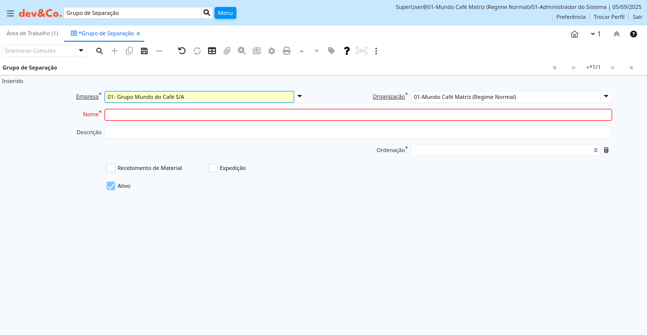 | Ativo | O registro está ativo no sistema | Existem dois métodos de tornar um registro indisponível no sistema: O primeiro é excluir o registro, o outro é desativar o registro. Um registro desativado não está disponível para seleção, mas está disponível para relatórios. Existem duas razões para desativar um registro ao invés de excluí-lo: (1) O sistema exige o registro para fins de auditoria. (2) O registro é referenciado por outros registros. Ex. você não pode excluir um Parceiro de Negócios, se existirem faturas para este parceiro de negócios. Você desativa o Parceiro de Negócios e previne que este registro seja usado para entradas futuras. | cof_gruposeparacao.IsActive character(1) Yes-No |