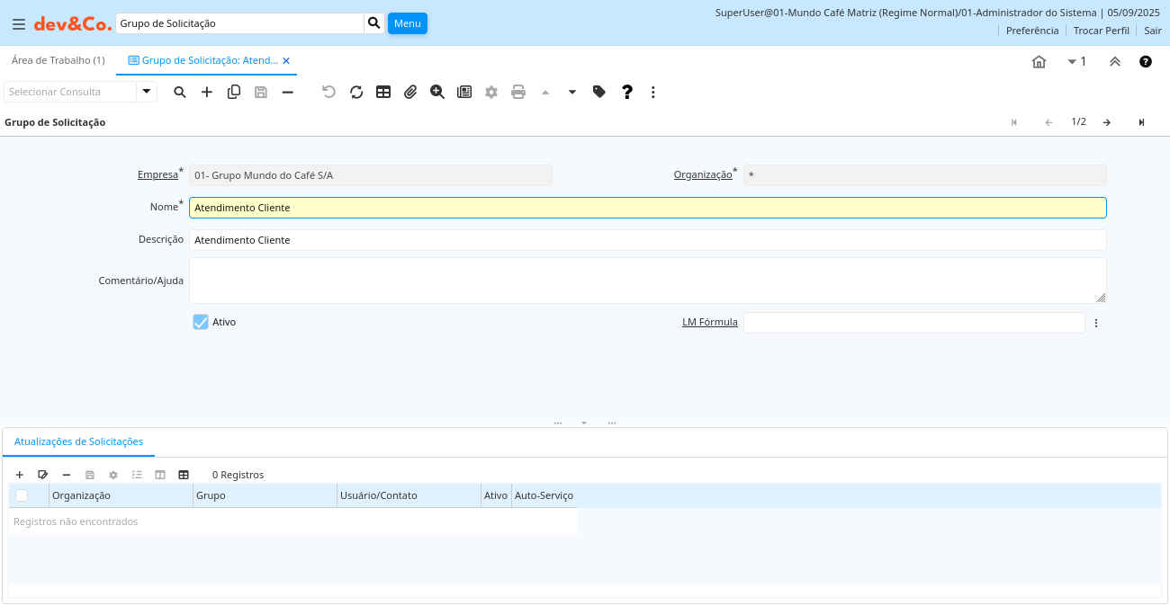 Ajuda: Grupo de solicitações (por ex. números de versões, responsabilidade, ... ). Uma Solicitação de Alteração de LDM será criada automaticamente se uma LDM for referenciada e habilitada no Tipo de Solicitação.