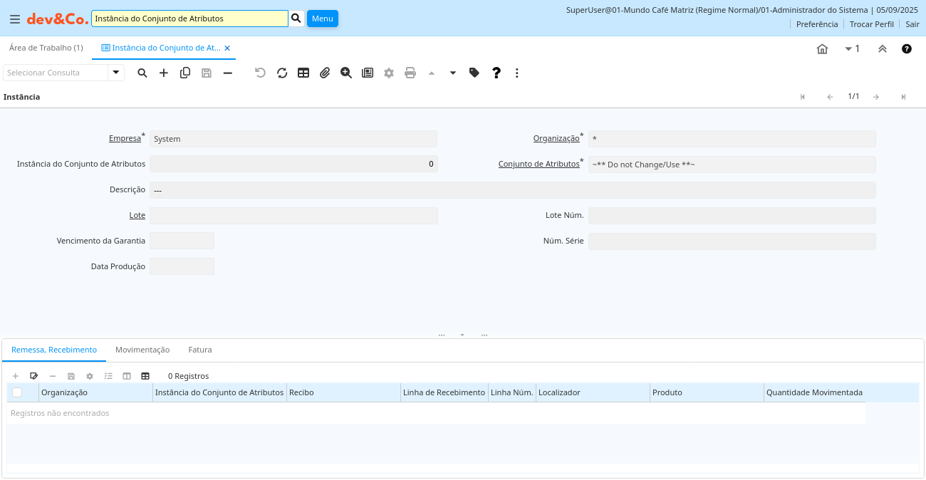 | Recibo | Documento de Recebimento de Material | Remessa/Recebimento de Material | m_inoutlinema_v.M_InOut_ID numeric(10) Search |