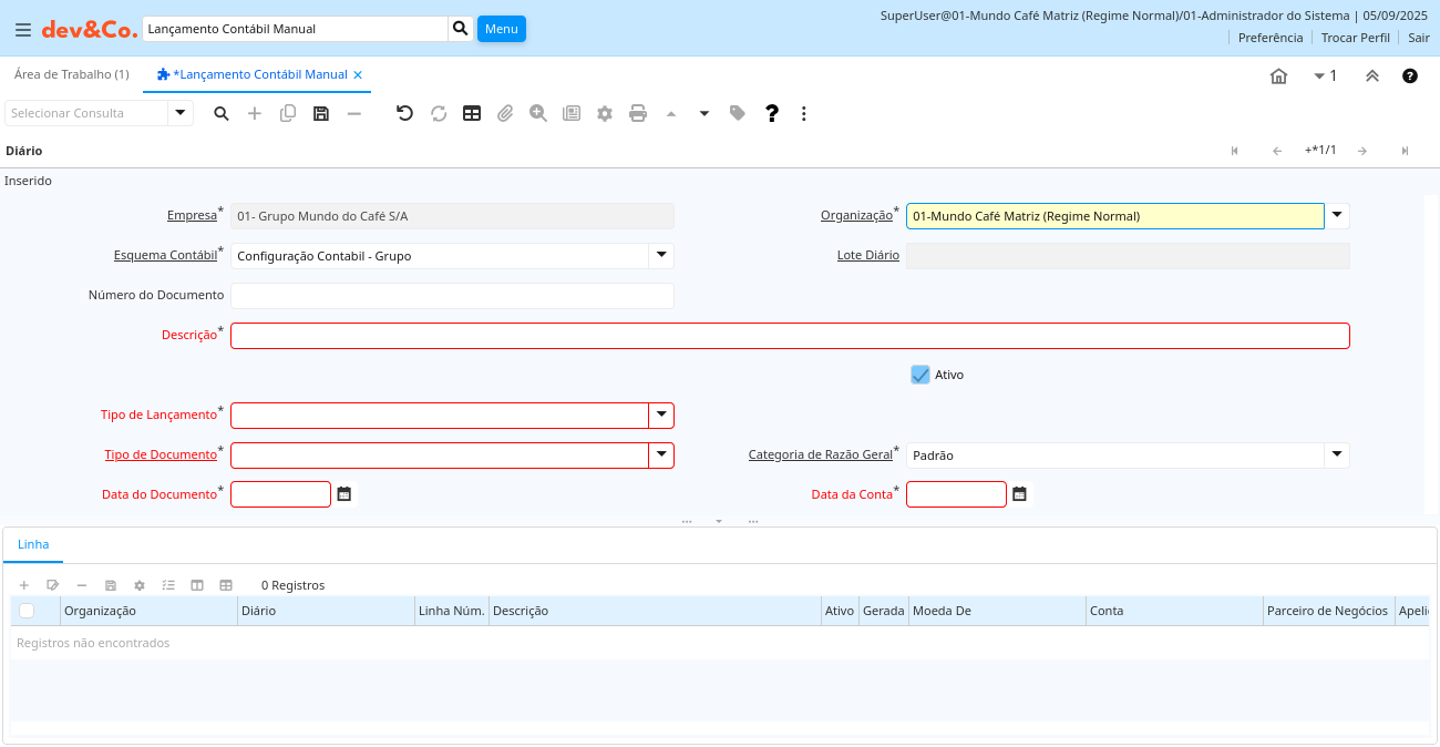Descrição: Criar e modificar lançamentos Contábeis manuais