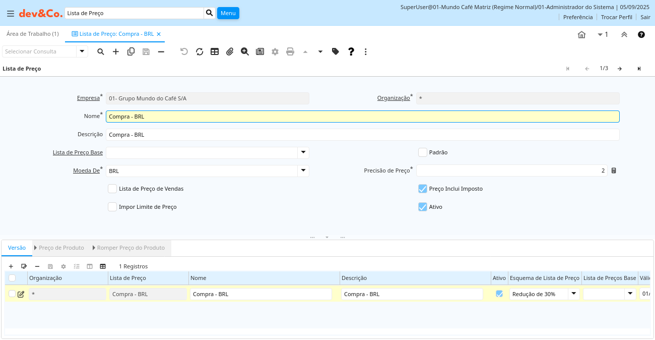 | Preço de Lista | Preço de Lista | O "Preço de Lista" é o preço de lista oficial na moeda do documento. | m_productprice.PriceList numeric Costs+Prices |