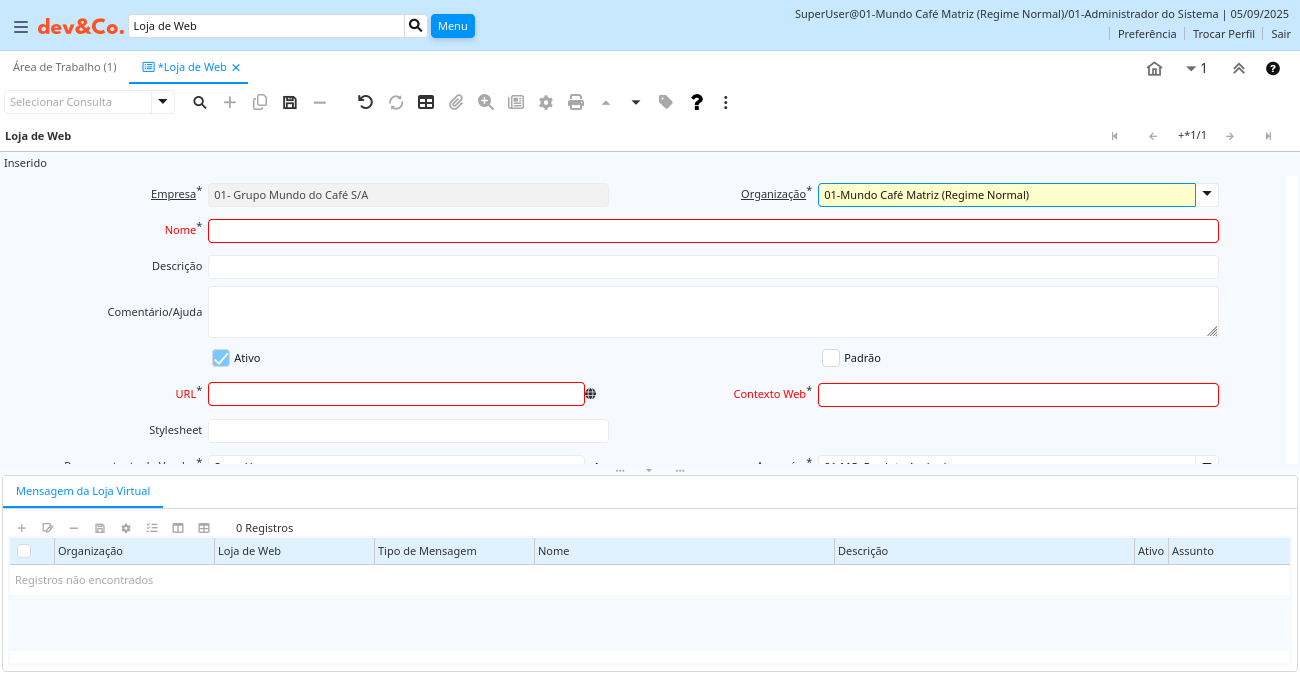 Ajuda: Define as configurações da loja virtual na Internet. O contexto do servidor de intenet deve ser único e determina as configurações utilizadas na transação real. O armazém selecionado determina a organização. As configurações de email são testadas com os parâmetros de configuração de email da empresa.