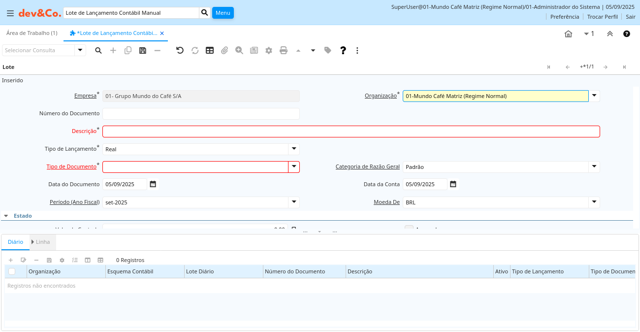 Janela: Lote de Lançamento Contábil Manual