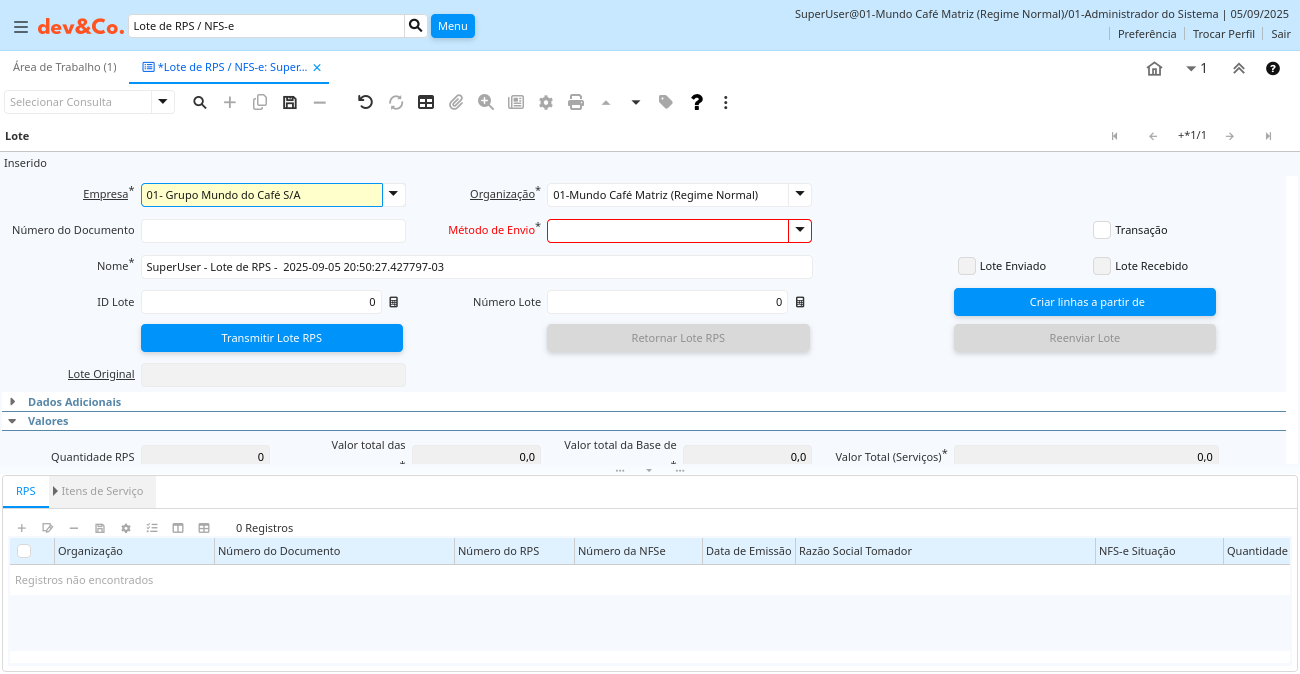 | Transmitir Lote RPS | cof_rps_lote.cof_Processing character(1) Button | ||