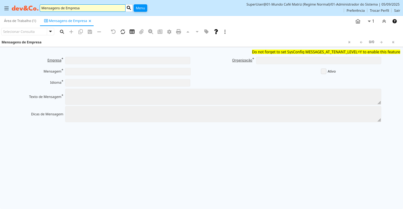 | Mensagem | Mensagem de sistema | Mensagens de informação ou de erro | ad_message_trl.AD_Message_ID numeric(10) Search |