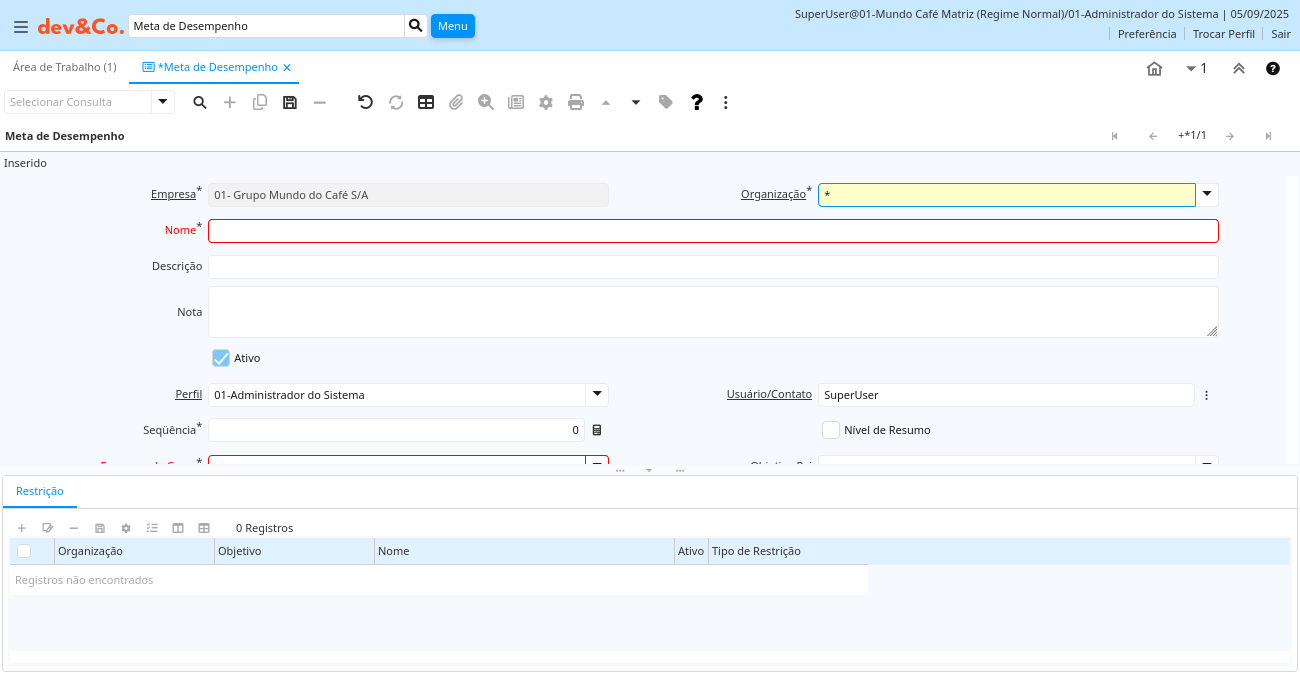 | Perfil | Perfil de Acesso | O "Perfil" determina o nível de segurança e acesso que um usuário que exerça este Perfil terá no Sistema. | pa_goal.AD_Role_ID numeric(10) Table Direct |