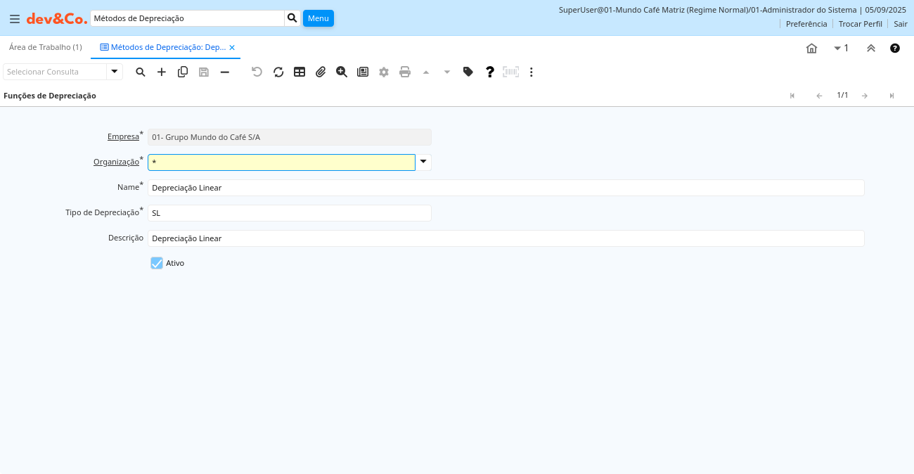 Ajuda: A janela de Método de Depreciação permite ao usuáiro revisar os métodos de depreciação no BrERP. Ex. método linear...