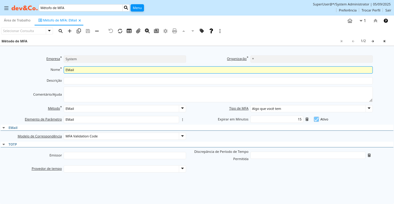 | Expirar em Minutos | mfa_method.ExpireInMinutes numeric(10) Integer | ||